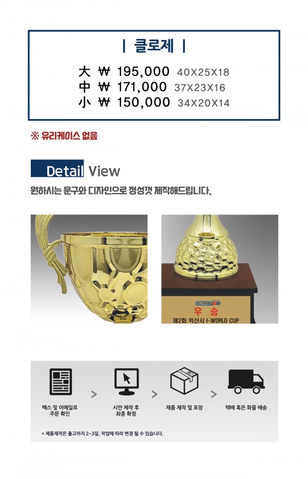 우승컵 트로피 클로제 (大 19만 5,000원, 中 17만 1,000원, 小 15만) 페이지 정보 작성자 관리자 작성일23-07-28 16:36 조회154회 댓글0건 관련링크 이전글 다음글 목록 본문 이전글 다음글 목록